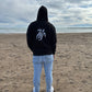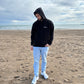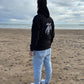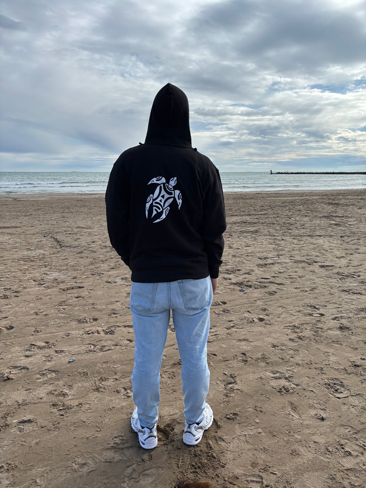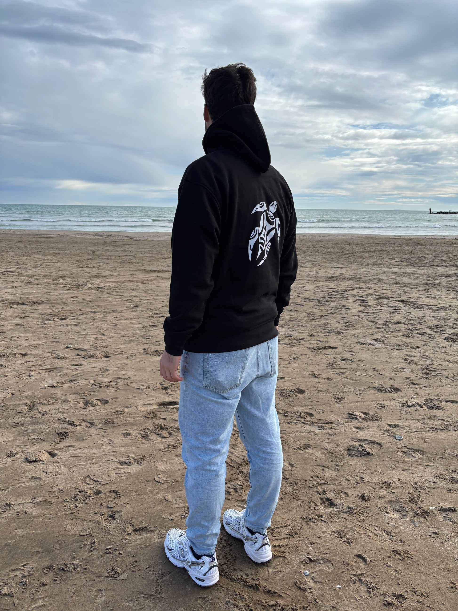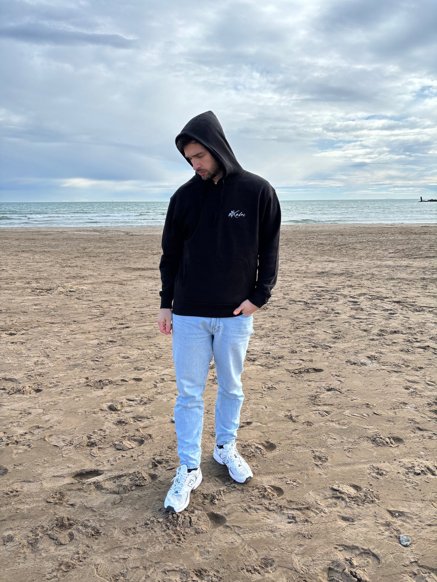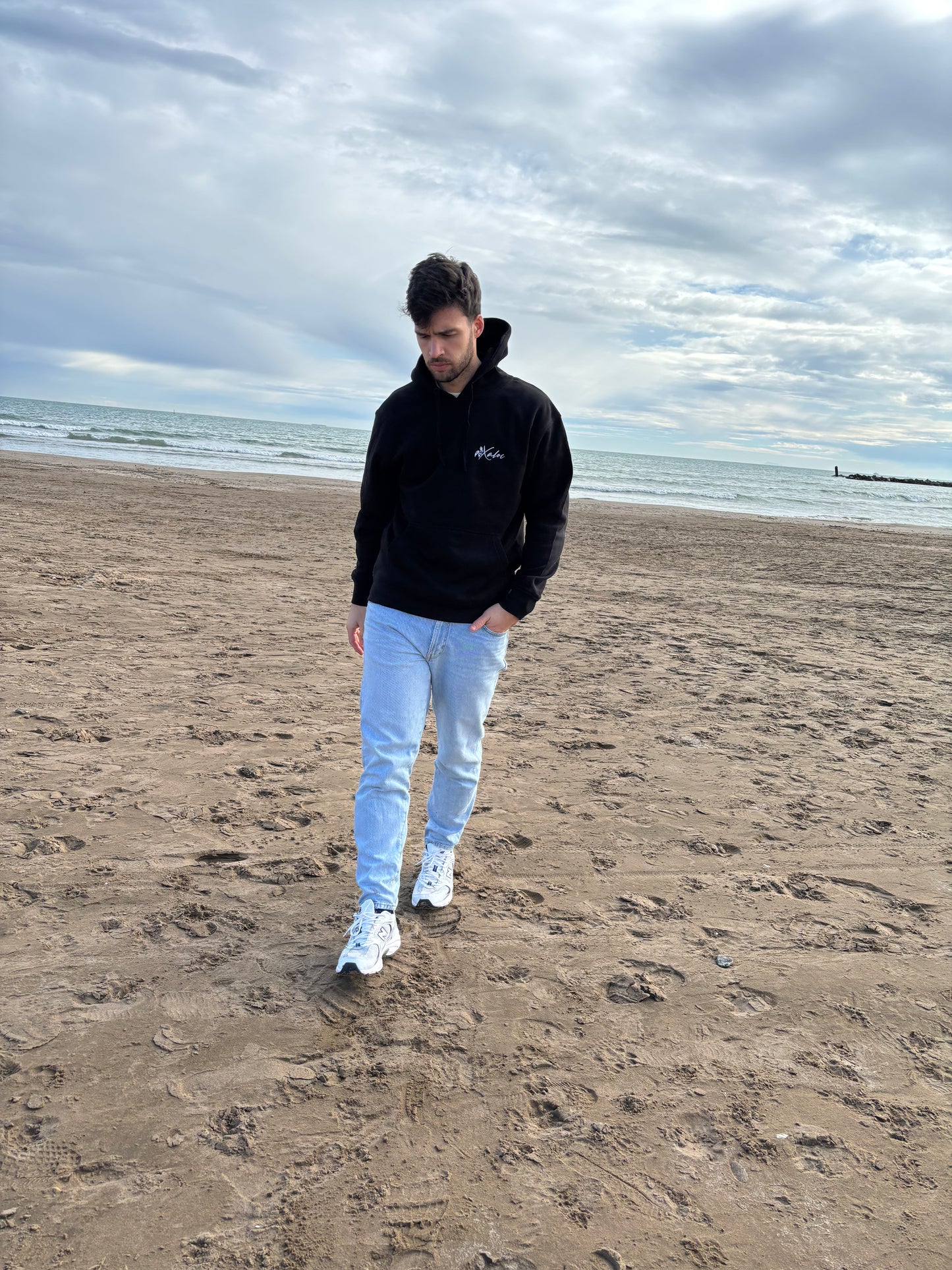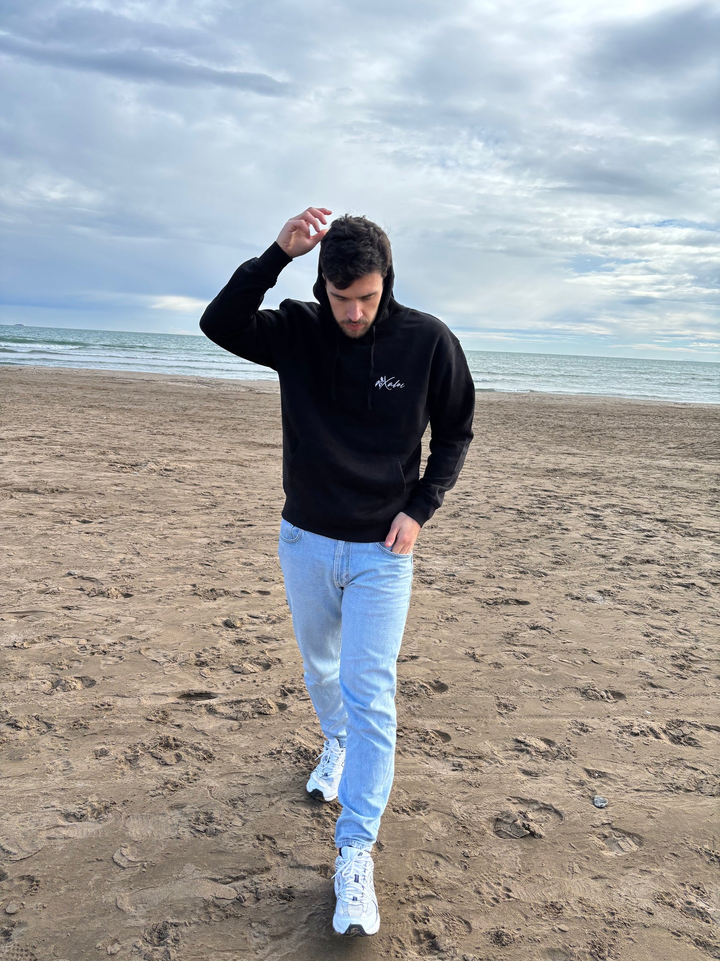 Sudadera negra con capucha. Bolsillo central y forro interno para el frío.